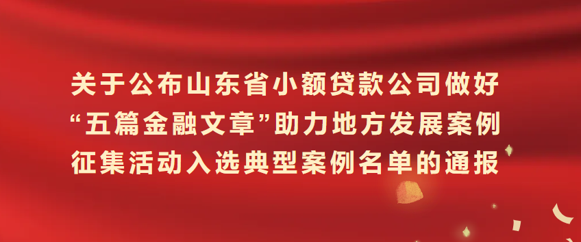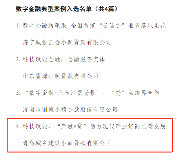 近期,山东省小额贷款企业协会发布《做好“五篇金融文章”助力地方发展案例榜单》,青岛城投城金集团旗下城乡小贷公司暖心贷、产融e贷两项业务分别入选绿色金融典型案例、数字金融典型案例。