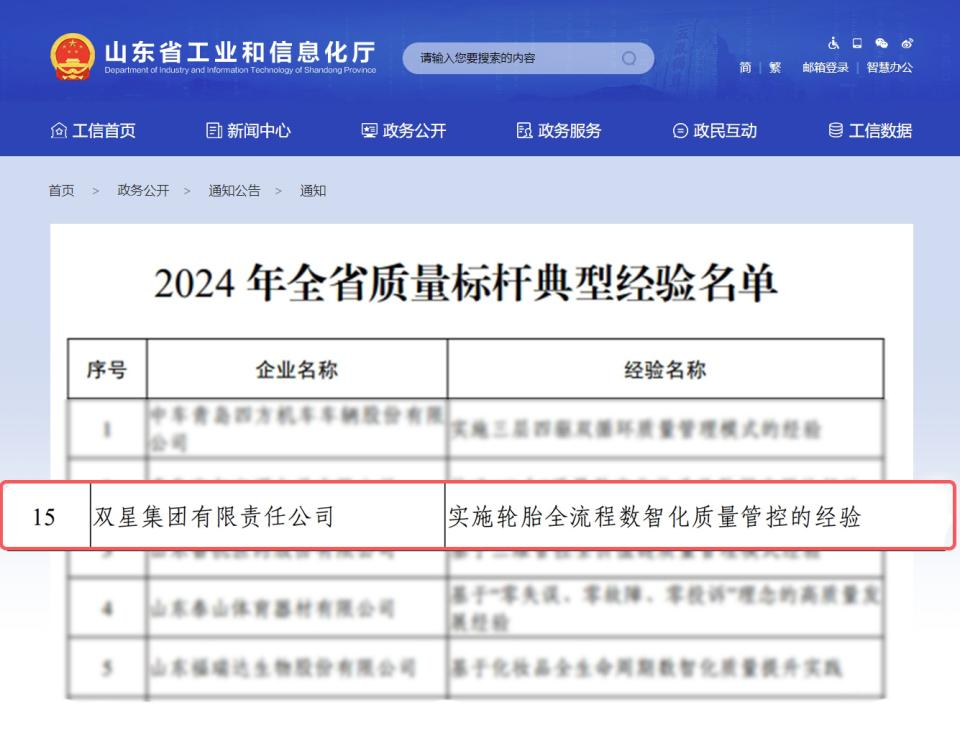 近日,山东省工业和信息化厅公布2024年全省质量标杆典型经验名单,双星集团“实施轮胎全流程数智化质量管控的经验”案例成功入选,成为轮胎行业唯一入选企业,彰显了双星在数智化质量管理中的示范引领作用。
