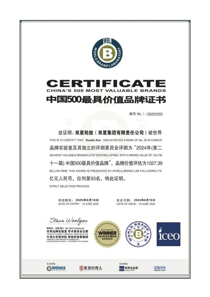 品牌价值突破千亿!双星轮胎荣膺“中国500最具价值品牌” 持续领跑中国轮胎品牌