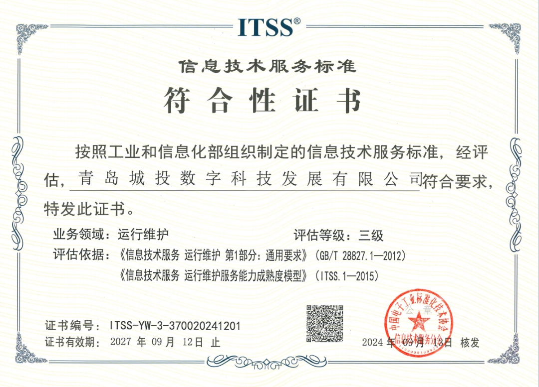 与此同时,数科公司获得的另一项行业体系认证ITSS(Information Technology Service Standards,信息技术服务标准),是我国信息技术服务业的首个国家标准体系,是衡量企业信息技术服务能力和水平的重要标尺。获得该项认证代表城投数科在信息技术服务的设计、开发、实施、运维及持续改进等全生命周期管理上,均达到了国家标准化要求的高阶水平,能够为客户提供更加专业化、标准化、高质量的信息技术服务解决方案。