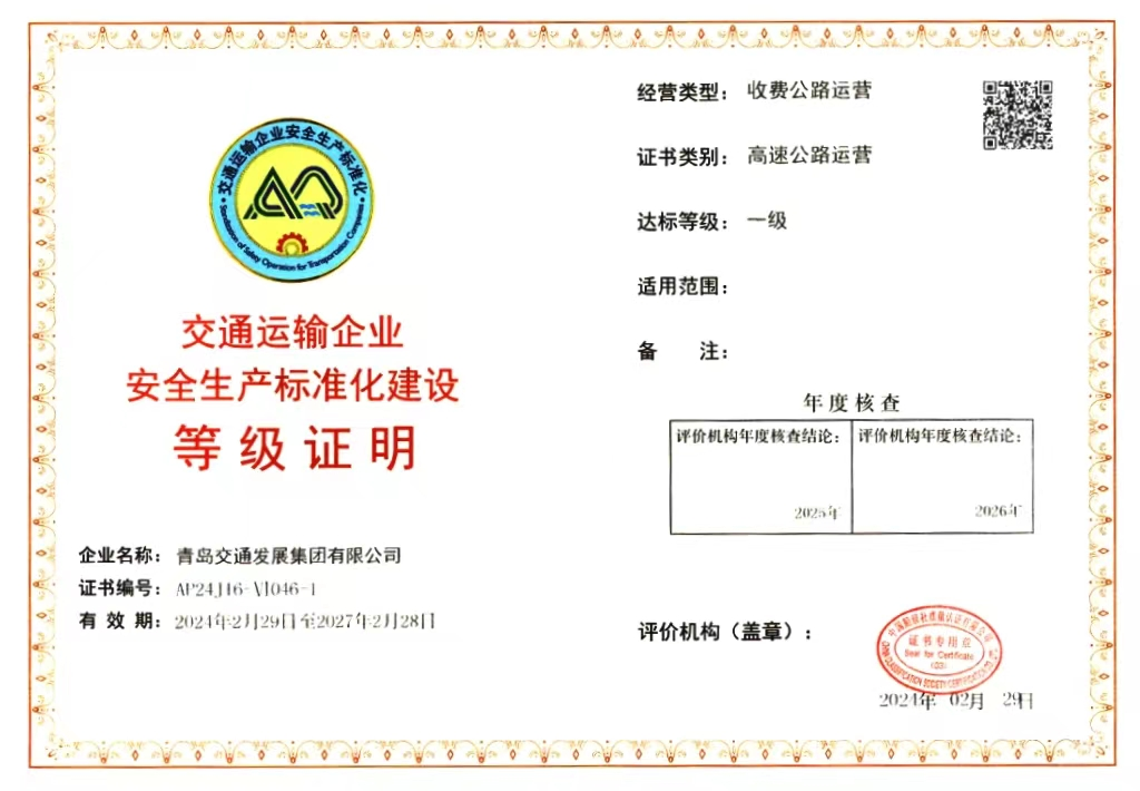 被交通运输部授权机构评为安全生产标准化建设一级企业