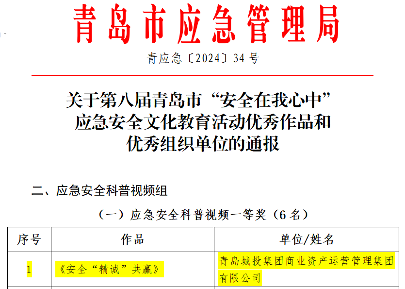 商管集团荣获第八届青岛市“安全在我心中”应急安全文化教育活动中荣获应急安全科普视频一等奖