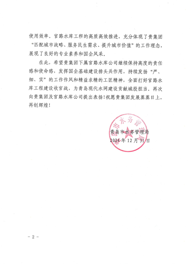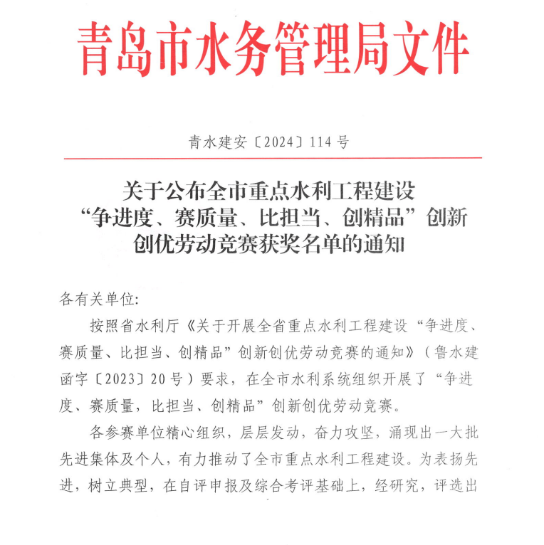 被青岛市水务局评为2024年度青岛市“争进度、赛质量、比担当、创精品”创新创优劳动竞赛文明工地、优胜集体