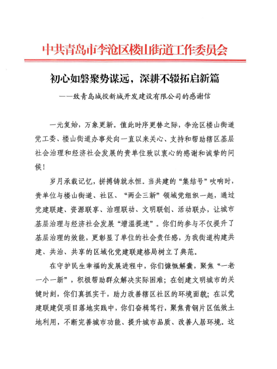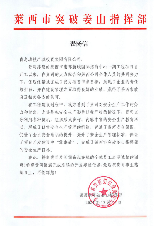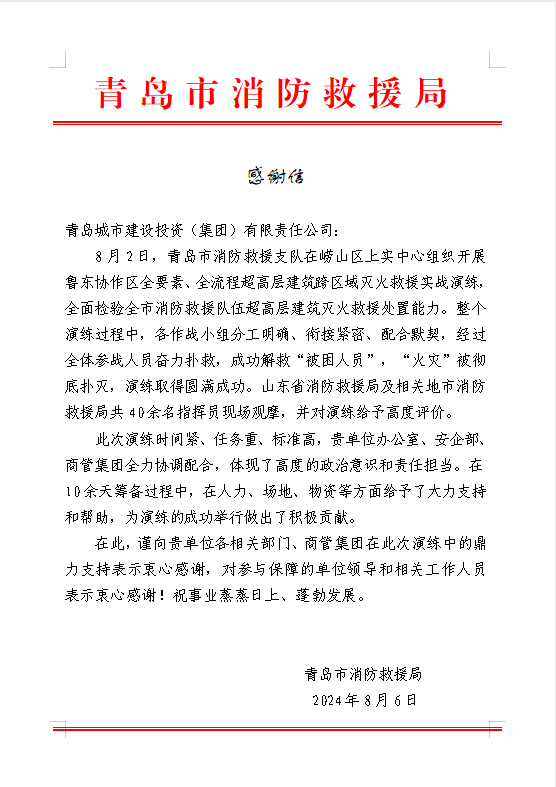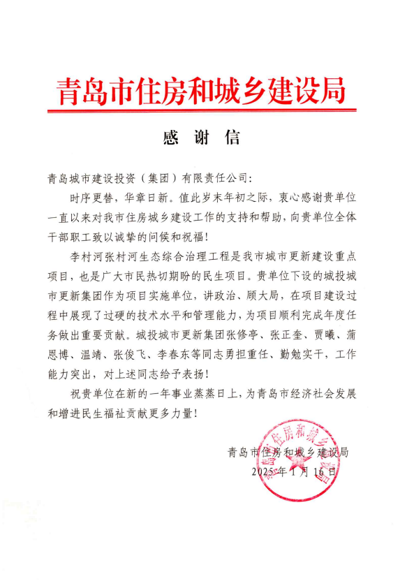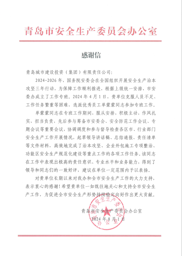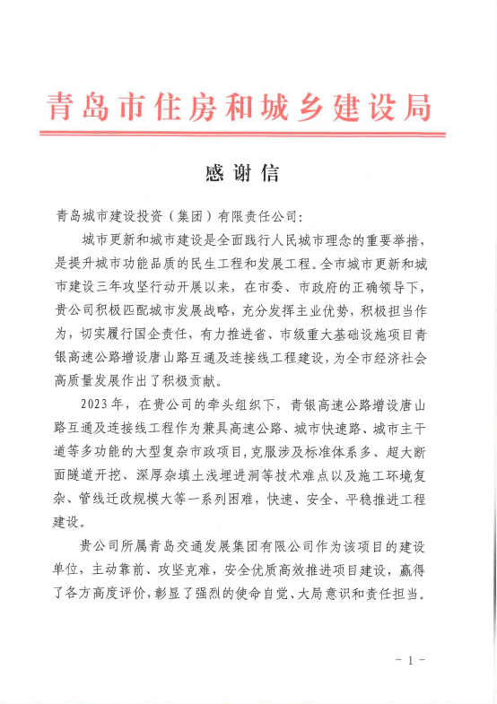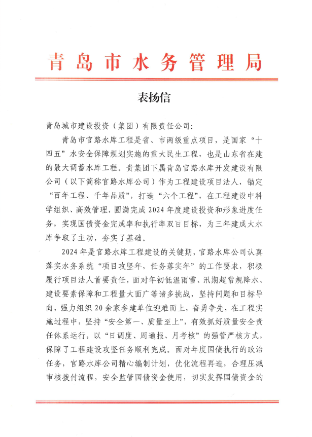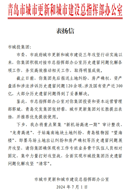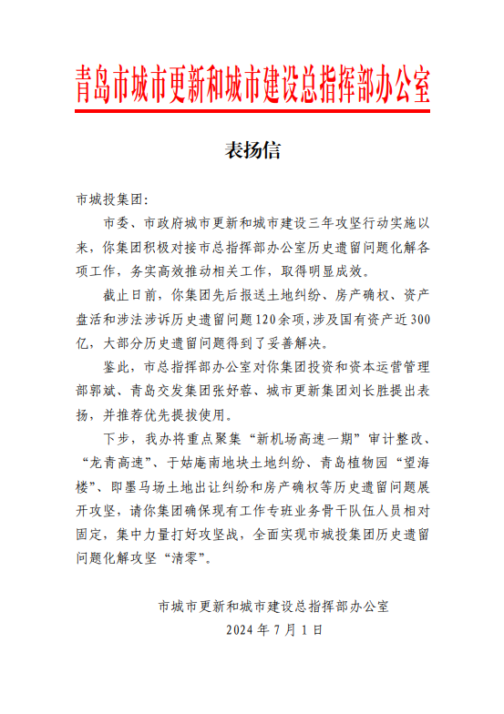 在过去的2024年,青岛城投集团全体干部员工全面贯彻落实党的二十届二中、三中全会精神,认真贯彻落实集团党委决策部署,以勇争上游的雄心壮志,“打头阵、当先锋”的进取意识,出色完成各项工作任务,涌现出了一批表现优异、成绩突出的集体和个人,收获了131项集体荣誉67项个人荣誉,以及来自多个单位的26封感谢信。社会各界的认可与感谢,就是城投集团继续奋进前行的不竭动力!以下为2024年度部分荣誉和感谢信集锦: