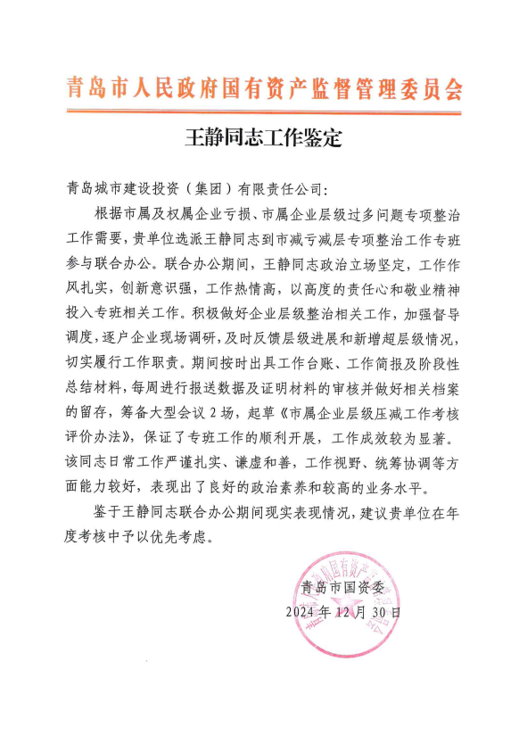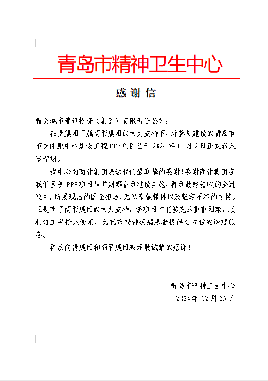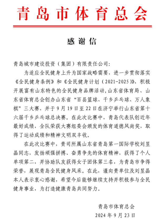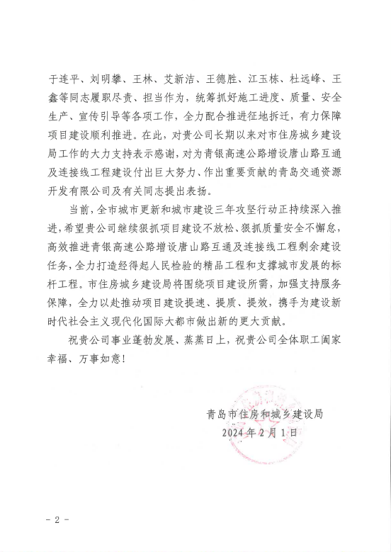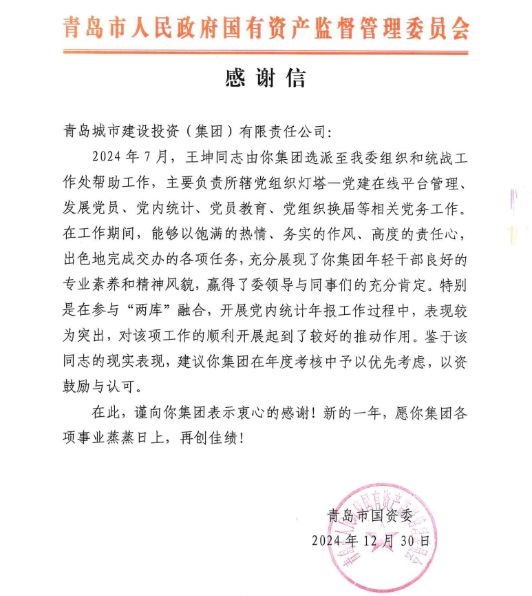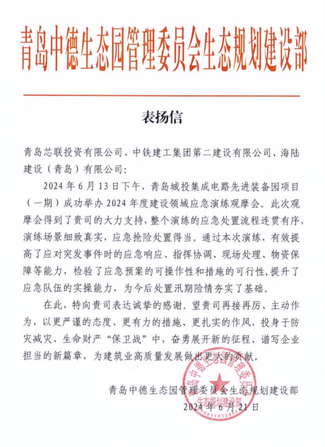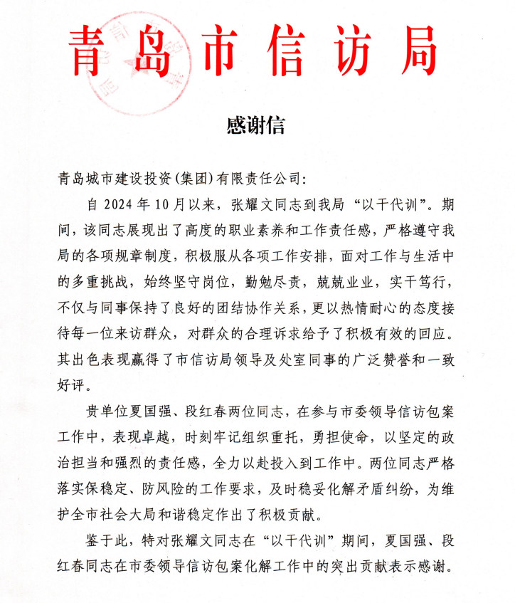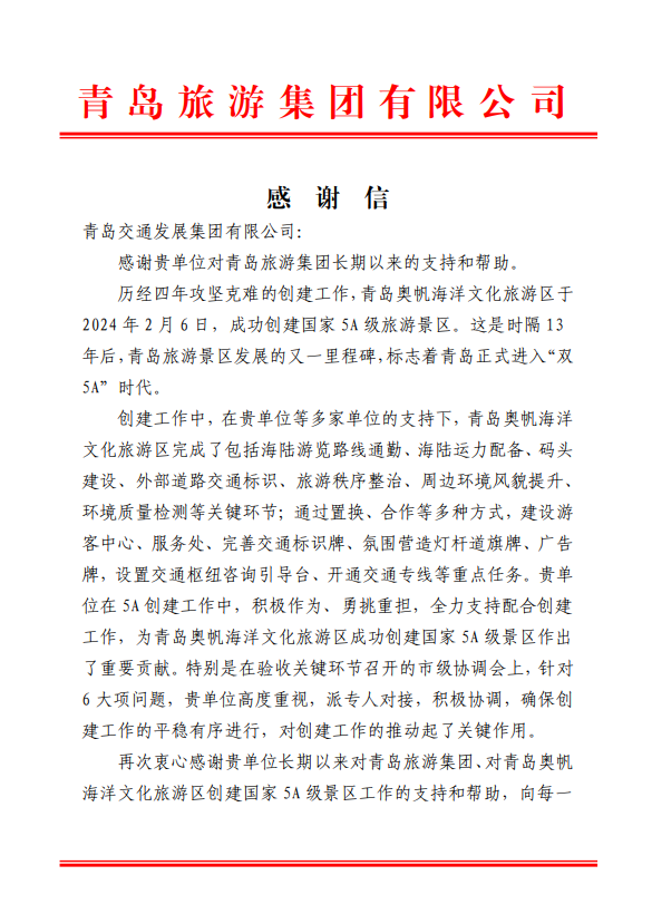 在过去的2024年,青岛城投集团全体干部员工全面贯彻落实党的二十届二中、三中全会精神,认真贯彻落实集团党委决策部署,以勇争上游的雄心壮志,“打头阵、当先锋”的进取意识,出色完成各项工作任务,涌现出了一批表现优异、成绩突出的集体和个人,收获了131项集体荣誉67项个人荣誉,以及来自多个单位的26封感谢信。社会各界的认可与感谢,就是城投集团继续奋进前行的不竭动力!以下为2024年度部分荣誉和感谢信集锦: