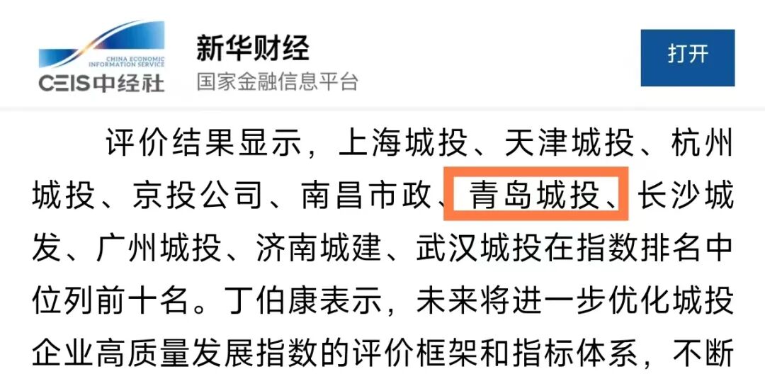 青岛城投集团荣登中国城投企业高质量发展指数排行榜第六名