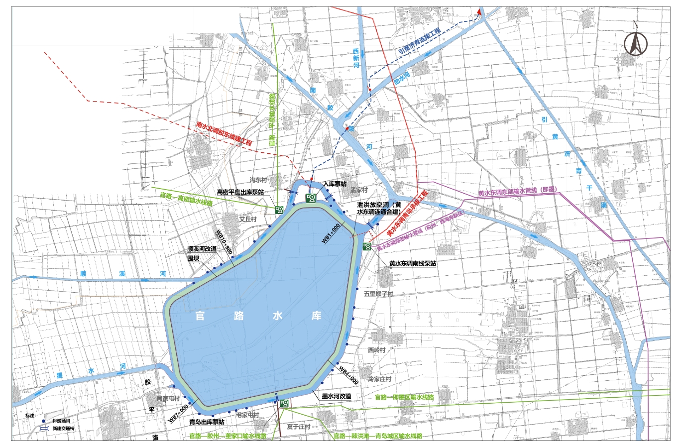 工程位于青岛胶州市西北的墨水河下游,北距平度市城区30km,南距胶州市城区15km,西距高密市城区18km。工程主要任务是近期调蓄黄水东调工程水量、当地雨洪水资源以及引黄济青干渠输送的山东省统筹调配的客水,为青岛市城镇生活及工业用水提供水源;远期在雨洪水和黄水东调水量基础上,新增调蓄山东省统筹调配的南水北调等客水,满足青岛供水需求,并兼顾高密市的部分用水需求。工程规模为大(2)型,共涉及胶州市、高密市、平度市三个县级市。水库总库容2.11亿立方米,死库容0.19亿立方米 ,兴利库容1.92亿立方米。总投资约91.45亿元,主要建筑物包括水库围坝、入库泵站、青岛出库泵站、高密出库泵站、泄水洞、墨水河及顺溪河改道、引黄济青连接暗渠等,项目建设期3年。