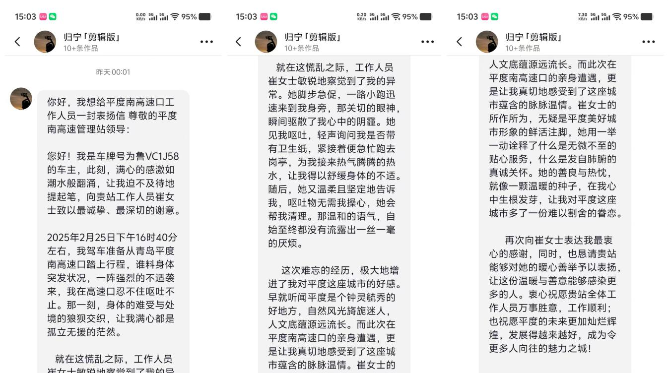 近日,一封通过抖音私信辗转传递的感谢信,让青岛城投集团旗下青岛高速集团平度收费站收费班长崔倩倩的暖心故事走入公众视野。平度市文旅局官方账号收到司乘人员特别致谢,信中记录的温情时刻,成为展现城市文明与青岛高速服务品质的生动缩影。(图为感谢信原文内容)2025年2月25日下午,一位车主行驶到平度收费站时身体突发不适,呕吐不止。崔倩倩发现异常后,迅速递上温水关切地询问车主状况,帮助舒缓身体不适,并主动清理现场