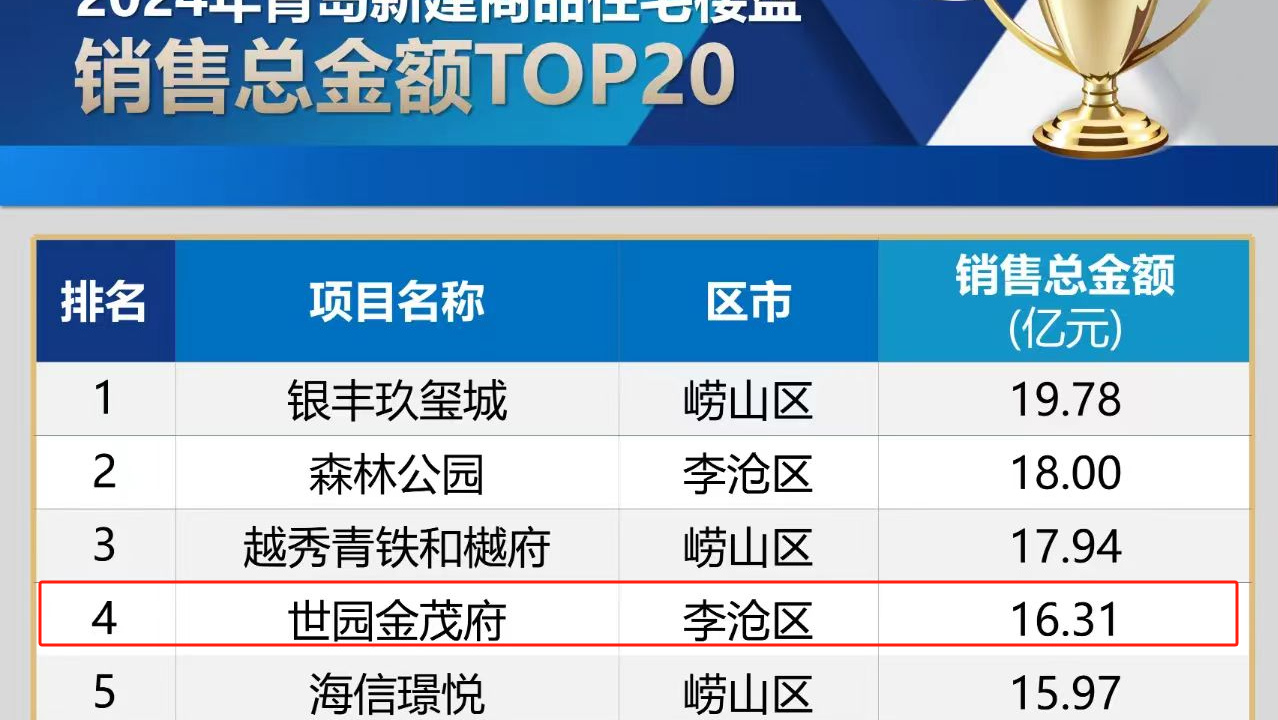 近日,2024年青岛市商品房销售榜单正式发布,青岛城投集团世园·金茂府项目以16.31亿元销售总金额荣登2024年青岛新建商品住宅楼盘销售金额榜第4名,超额完成全年销售目标任务。(图为青岛锐理数据截图)世园·金茂府是青岛城投集团与金茂集团联合打造的标杆型人居产品,占地160亩,规划地上建筑面积20.89万平方米。项目自2023年1月开盘以来,便备受市场关注。(图为世园·金茂府项目)项目位于4A级景区世博园内,对望百果山,五纵