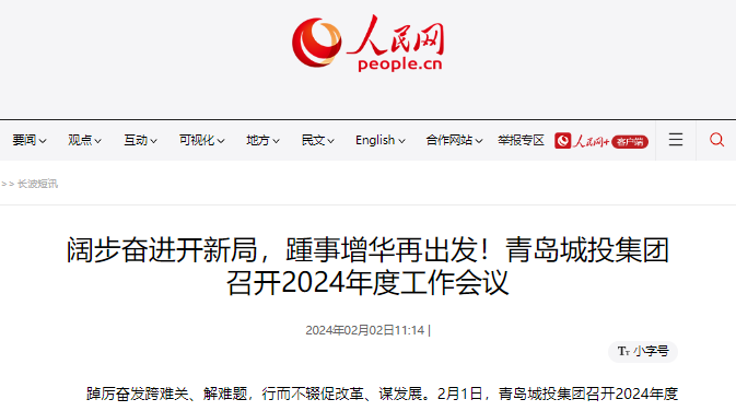 • 人民网:阔步奋进开新局,踵事增华再出发!青岛城投集团召开2024年度工作会议
